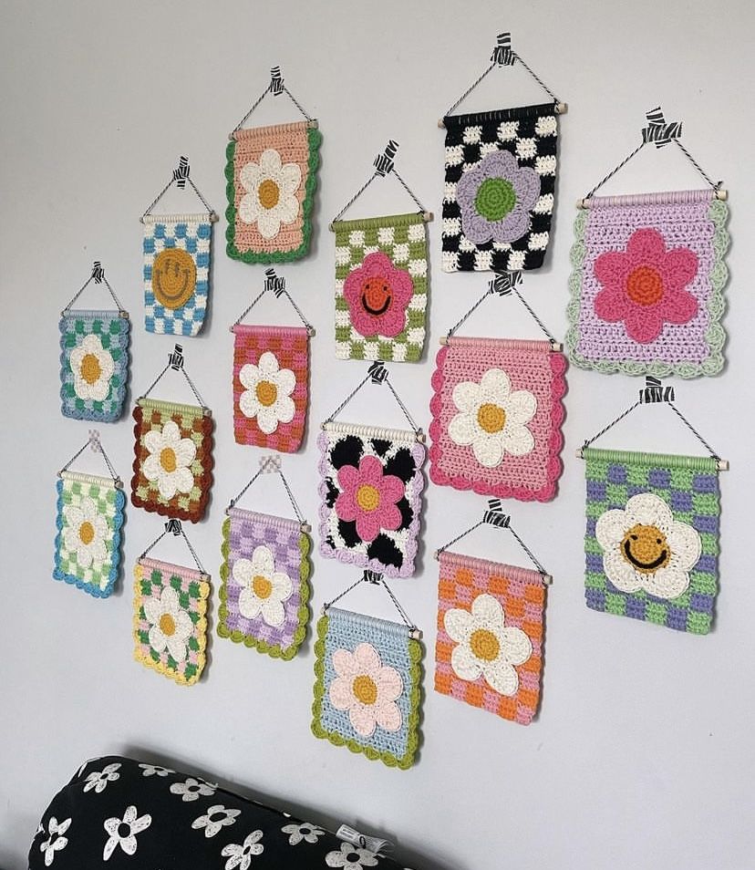 Tranh treo tường handmade được móc tay thủ công 100% với họa tiết hoa cúc xinh xắn, phối màu pastel nhẹ nhàng tạo cảm giác ấm áp và dễ thương cho không gian.